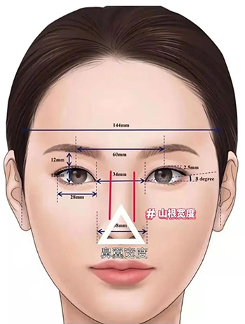 2、从正面看山根宽度一般是鼻翼宽度的三分之一;