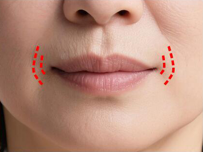 表现:唇周两侧出现深深的弧形凹陷,又叫括号纹,嘴角纹