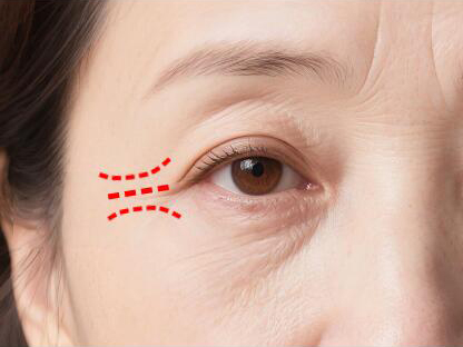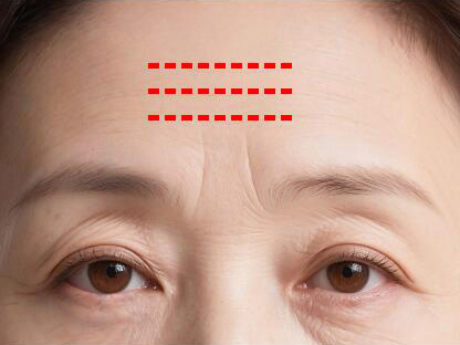 表现:额头的横向皱纹,多为横纹,眉毛扬起或抬头时更加明显,严重者静态表情下也很明显