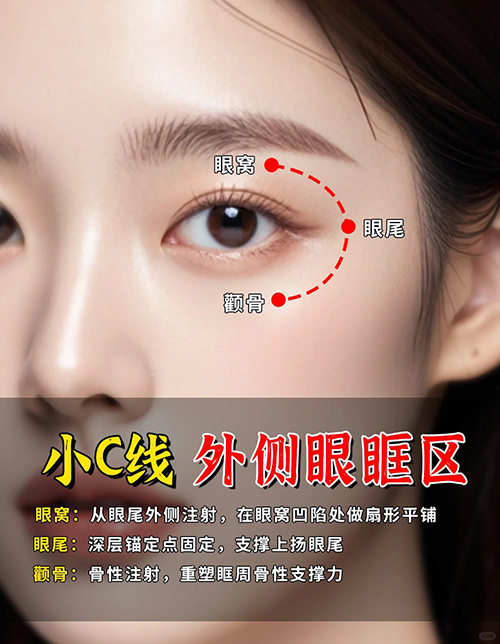 眼窝:眼尾外侧注射,眼窝凹陷处做扇形平铺