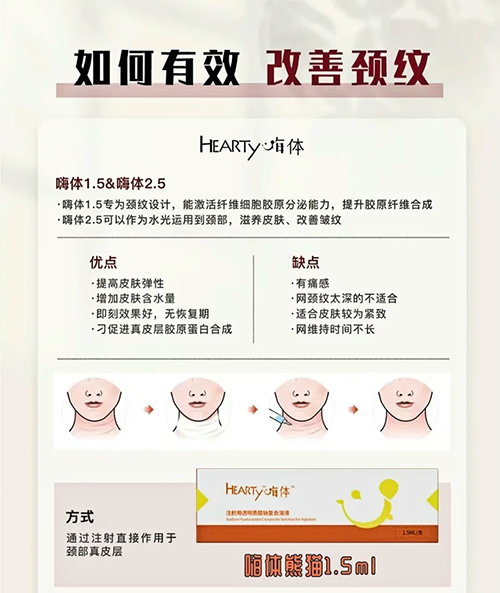 嗨体本质也是一种玻尿酸复合溶液,因此具有填充凹陷的作用,通过填充把凹陷的颈纹支撑起来。